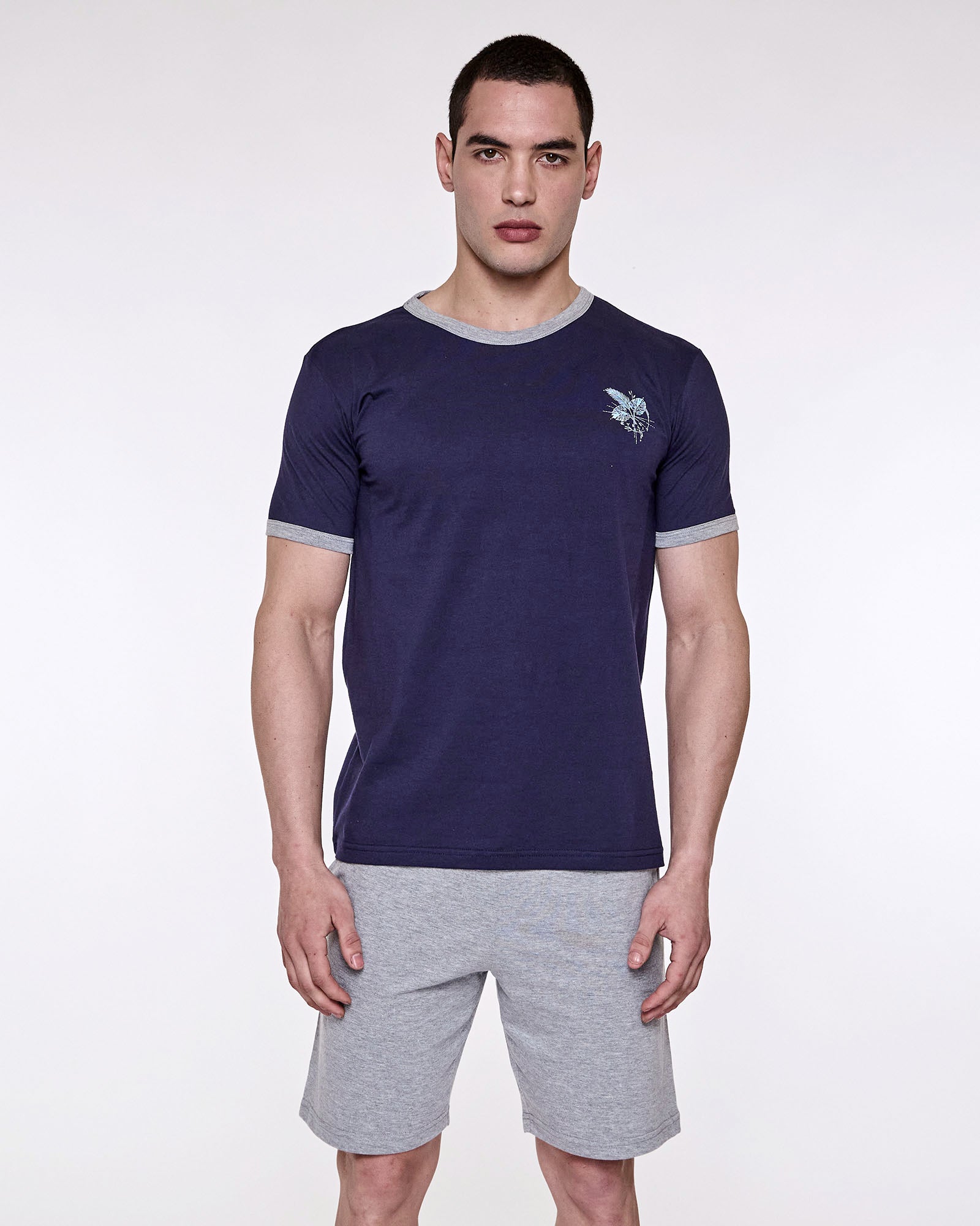 Pijama de hombre manga corta escote redondo, de jersey algodón natural. Tejido suave, resistente, duradero e hipoalergénico. Prenda suelta y cómoda