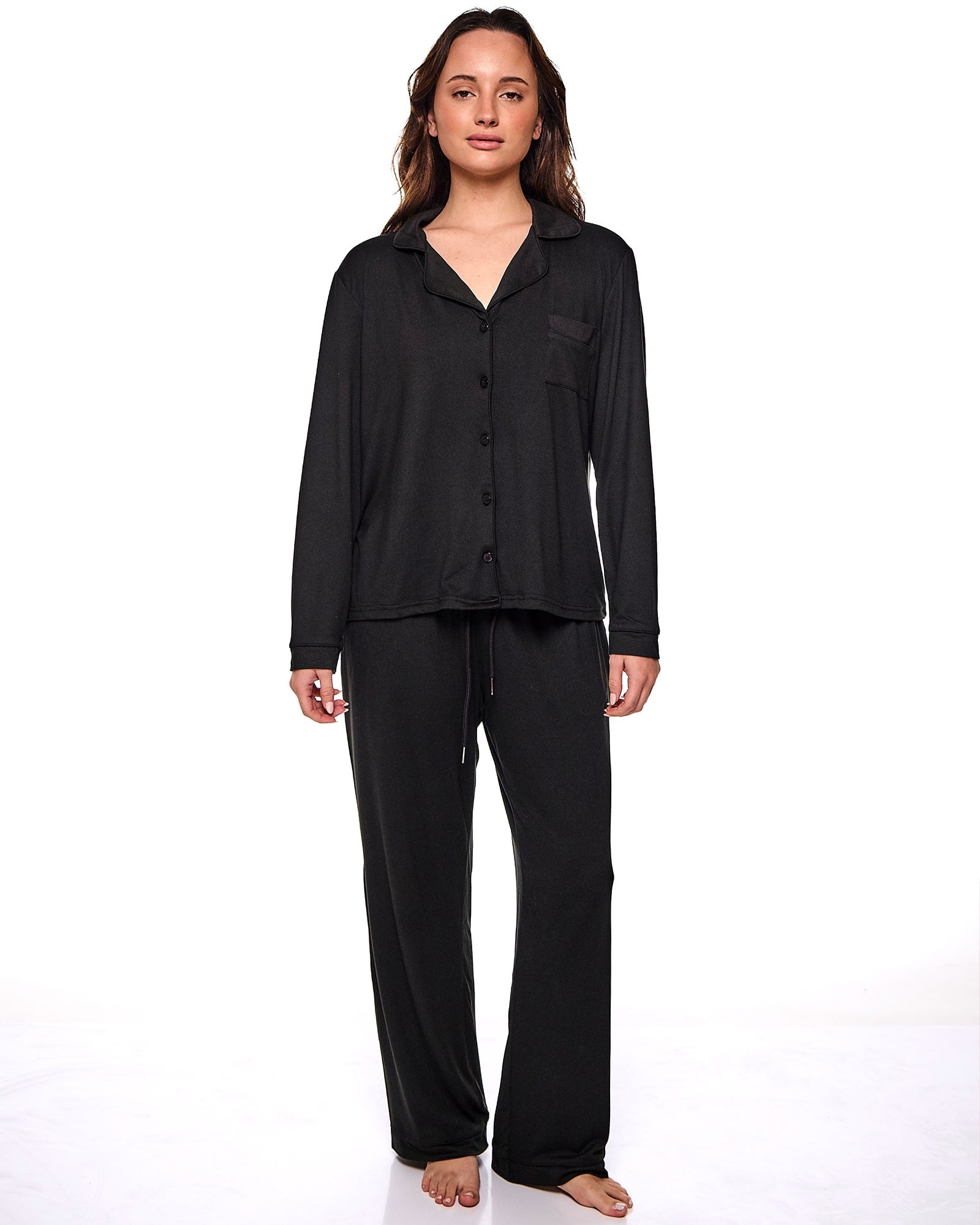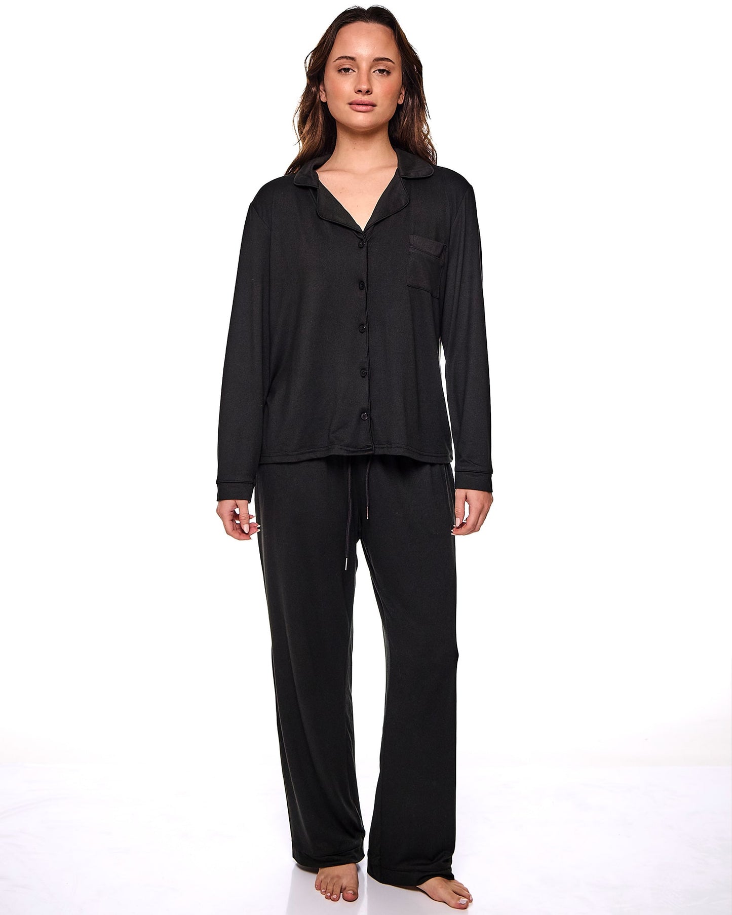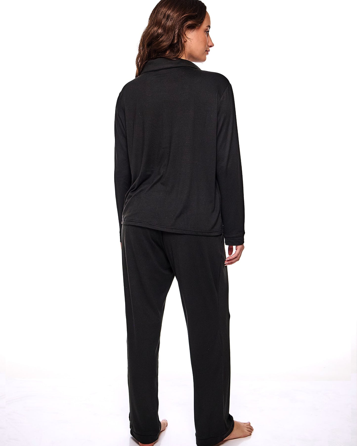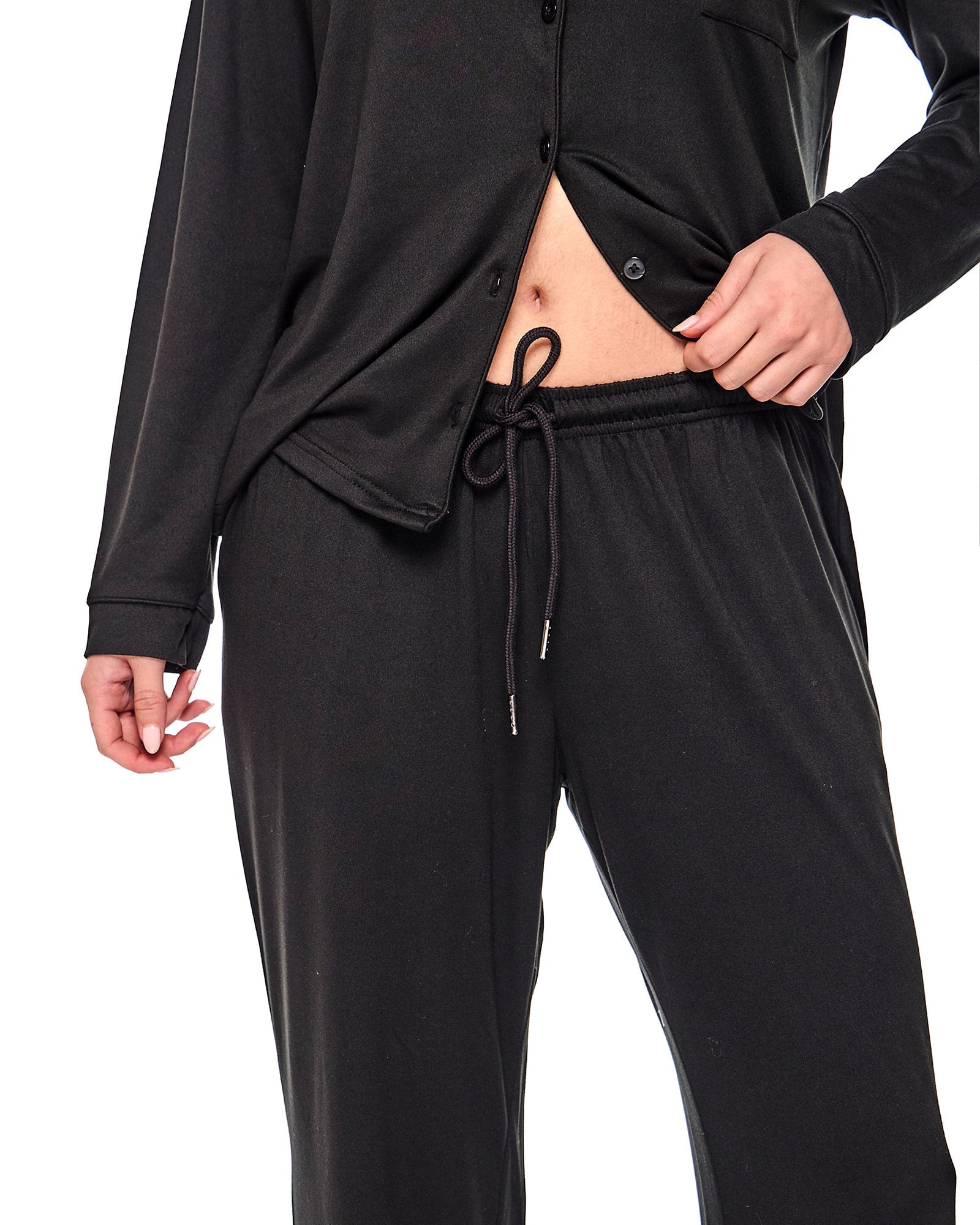 Traje pijama en microfibra con elastano ultra suave, liviano y confortable. Abotonadura central y vivos al tono en casaca y pantalón.